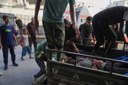 Skadede palestinere fraktes til Nasser-sykehuset etter israelske angrep i Khan Younis søndag.…