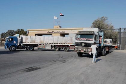Lastebiler som frakter nødhjelp venter utenfor Rafah-grenseovergangen mellom Egypt og Gazastripen torsdag.…