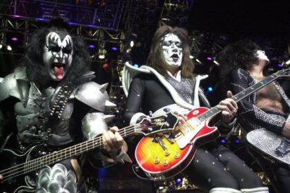 Ace Frehley (i midten) i karakteristisk Kiss-sminke sammen med bandkompisene Gene Simmons…