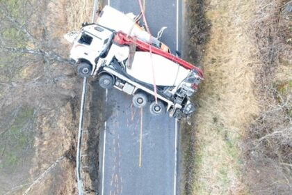 Betongbilen havnet oppå varebilen i ulykken. Passasjeren i varebilen omkom. Foto: Statens…