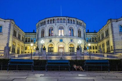 En rødrev utenfor stortingsbygningen i Oslo sentrum. Kanskje kan reven jakte ned…