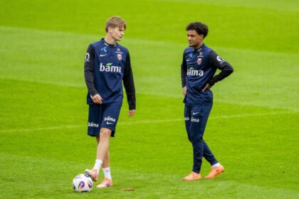 Norges David Møller Wolfe og Oscar Bobb på onsdagens trening på Åråsen.…