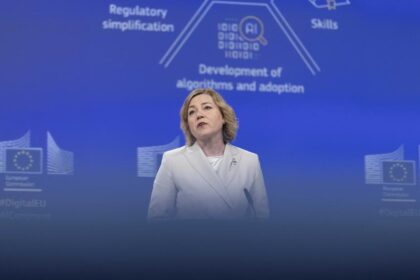 Henna Virkkunen, EUs teknologisjef, under en pressekonferanse i Brussel i april. Foto:…