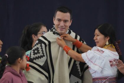 Ecuadors president Daniel Noboa får en poncho i gave under et arrangement…