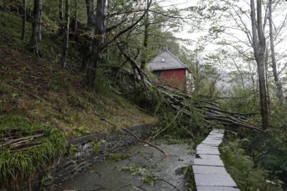 Flere trær har falt og knekt under stormen Amy. Denne hytta på…