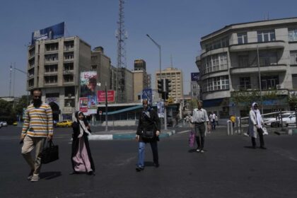 Folk krysser en gate i sentrum av Teheran i august. Foto: Vahid…