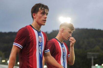 Norges Magnus Riisnæs og Sindre Walle Egeli under EM-kvalifiseringskampen mot Slovenia på…
