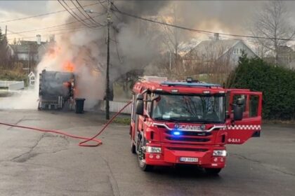 Gassdrevet søppelbil i full brann – flere eksplosjoner filmet