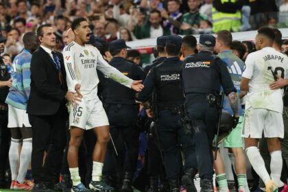 SISTE: Etter sluttsignalet tok det fullstendig fyr mellom de to lags benker.…
